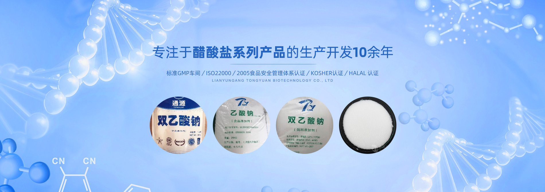 連云港市通源生物科技有限公司 是生產(chǎn)雙乙酸鈉、無(wú)水醋酸鈉、三水醋酸鈉、醋酸鉀、乙酸鈉、丙酸鈉、丙酸鈣和氯化鉀等系類醋酸鹽產(chǎn)品的專業(yè)制造商。公司專注于醋酸鹽系列產(chǎn)品的生產(chǎn)開發(fā)10余年,是國(guó)內(nèi)專業(yè)醋酸酸鹽產(chǎn)品生產(chǎn)基地?! ∧壳?,我們已和全球30多個(gè)國(guó)家和地區(qū)建立長(zhǎng)期的業(yè)務(wù)合作關(guān)系,是中國(guó)較大的雙乙酸鈉生產(chǎn)商和出口商之一。作為中國(guó)食品添加劑和配料協(xié)會(huì)理事單位,通源公司已建成標(biāo)準(zhǔn)GMP車間5000余平方米,通過(guò)了ISO22000:2005食品安全管理體系認(rèn)證、KOSHER認(rèn)證、HALAL 認(rèn)證等,這些都是我們提供高質(zhì)量產(chǎn)品和優(yōu)良服務(wù)的前提和確保?! ∩a(chǎn)出色產(chǎn)品,提供優(yōu)良服務(wù),滿足顧客需要,是我們努力的目標(biāo)。愿和我們的朋友們攜手,共... →查看詳細(xì)